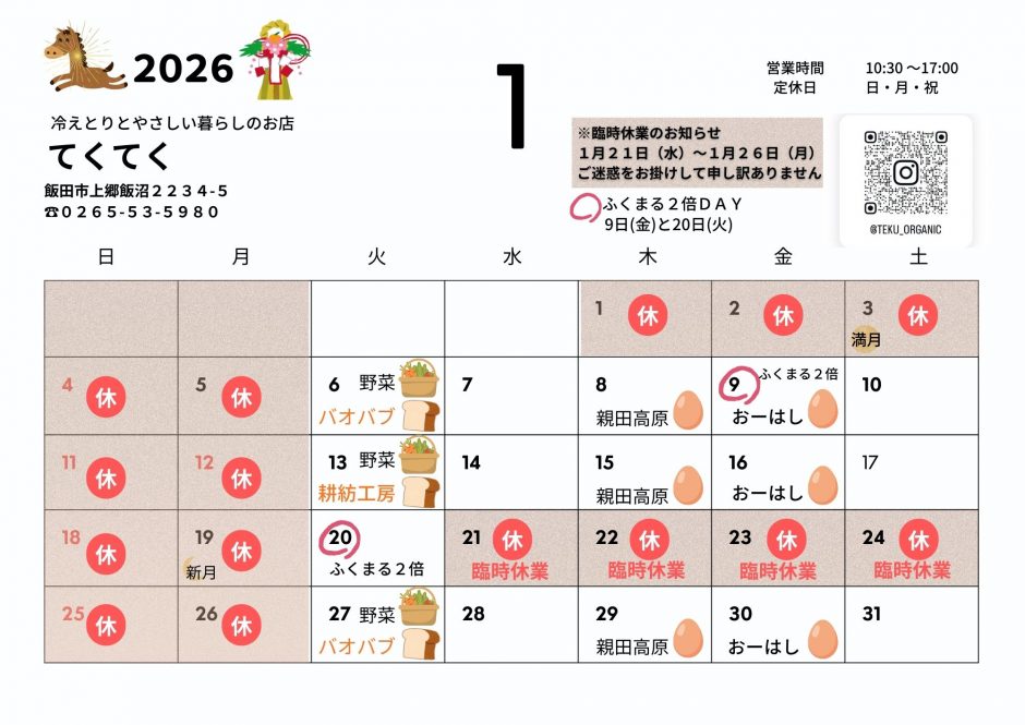 ⭐臨時休業:1月21日(水)~1月26日(月)
