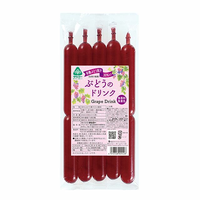 暑い時期になると、食べたくなるチュッチュ。子どもも大好きなおやつですよね♪「サンコー」より、無香料・無着色のぶどう果汁入りチュッチュができました。国内産の濃縮ぶどう果汁を30%入れています。冷凍庫で凍らせてから、シャーベットとしてどうぞ。美味しくてそのまま飲んでしまう子もいますよ~■濃縮果汁 30%入り≪お召し上がり方≫ 冷凍する前に、よく振ってから凍らせてお召し上がり下さい。