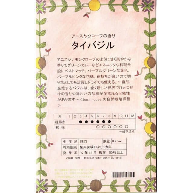 静岡バジルハウスの自然栽培種 特徴 タイをはじめとする東南アジア系の料理にベストマッチ。アニスシナモンクローブなどのように甘くさわやかな香りでグリーンカレーなどエスニック料理全般にマッチします。パープルグリーンな葉色パープルピンクな花穂。花もちがいいので切り花としても活躍できドライフラワーとしても使えます。 育て方霜の心配がなくなってから蒔きます。株間を15~20センチとり、1カ所5~6粒点蒔きします。プランター栽培の場合はバラ蒔きして適宜間引きながら収穫します。最終的に株間20センチほどにします。バジルは幼苗期には移植できるのでポット等に播種して本葉2~4枚の時に定植しても構いません。花蕾は早めに摘み取ると葉の収穫量が増えます。発芽後50日くらいから葉が摘めます。ドライハーブにするには梅雨明け後開花直前が適期です。鉢づくりでは冬場は日の当たる室内に置けば年中緑葉が楽しめます。トマトと一緒に植えるとコンパニオンプランツとして最適ですが日光を必要とするのでトマトの陰にならないように注意します。摘んだところから芽が出るので、霜が来るまで収穫できます。 光郷城 畑懐代表 中村訓さんメッセージ 国内での採種を増やしたい。採種農業者を増やしたい。 種の採種の 90% は海外です。そのわけは、採種価格が安すぎること。農産物の価格が安すぎること。農業が軽視されていること。 僕の農業の先生の言葉、「農業の滅びる国に繁栄はない」 よし、種採りの現場から適正価格を積み上げるのだ!! なんでも最初は民間から変わる。 小さなそして大きな一歩。 浜名農園・畑懐の種の特徴 1 伝統野菜(在来種・固定種)の種子販売が得意です 日本全国の様々な地域の風土に根ざし昔から食べられている個性的な野菜のことを伝統野菜と呼んでいます 香り豊かで、甘味とうま味が濃く懐かしい味、そして種採りが出来るので、生命が継続していける野菜でもあります。 そんな伝統野菜(在来種・固定種)を中心に販売しています。 2 国内産の種に力を入れています 昔ながらの伝統野菜(在来種・固定種)を栽培し種採りをしてくれる方々は皆さんご高齢で 現実的に続けられなくなってしまっています。 何十年もかけて継続してきた良い系統(血筋)が途絶えてしまうのは大変残念なことです。 畑懐では、今は少なくなってしまっている国産の種を全国の種屋さんから集め、また一部の品種の種採り契約栽培を少しずつ増やしています。 3 自信をもって選んだ「美味しい」野菜の種を販売 「種売り場で種を選んでも何が良いかわからない」 という方が多いのではないでしょうか?F1種?交配種?早生、晩生?など専門用語ばかりが書いてありなんだか難しく思えたりしますよね。畑懐ではとにかく「美味しい」ということを基準に種の品種を選んでいます。 お客様の反応などを参考にし、サラダ、煮物、漬物向きなど野菜の特徴・個性を考え、種を選んでいます。 自ら、栽培し美味しいと思う品種・味が良いのに商品化されていない隠れた品種など、 種屋のプロが選び販売しています。