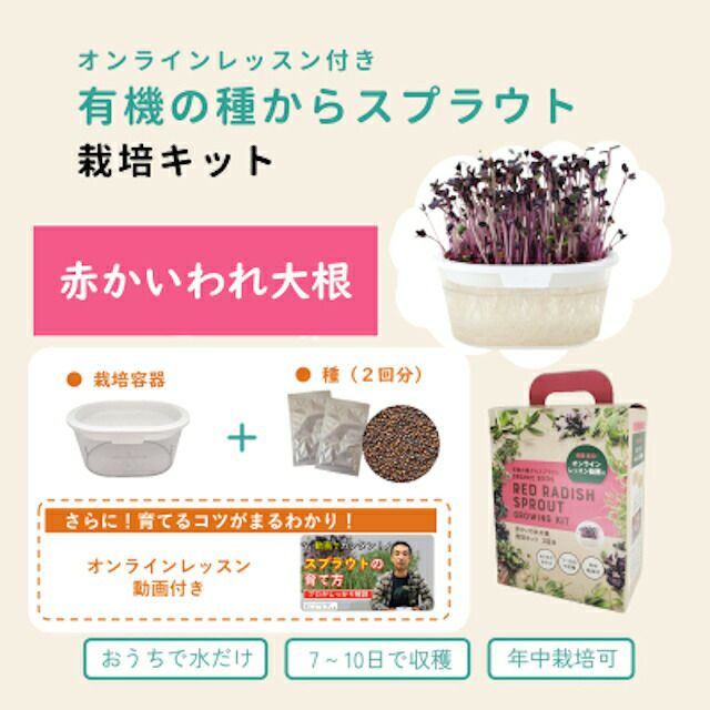 赤カイワレ大根スプラウト栽培キット オンラインレッスン動画・有機の種付き