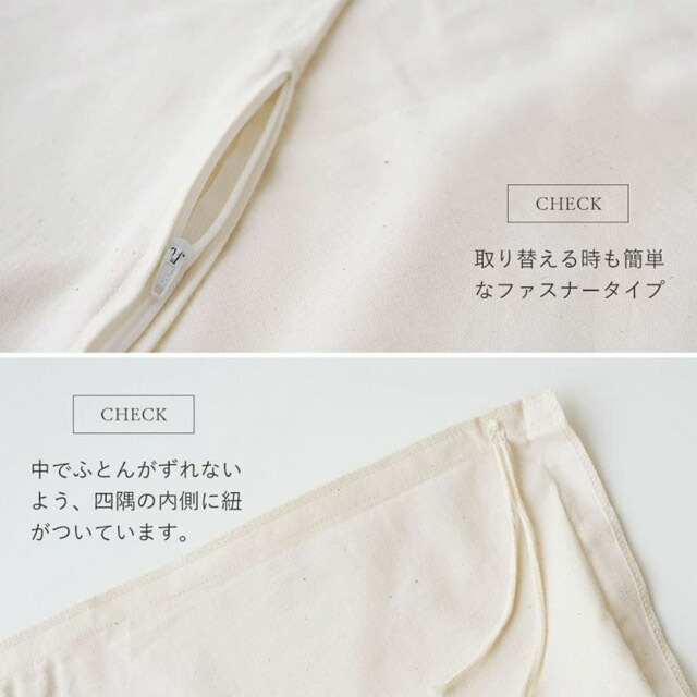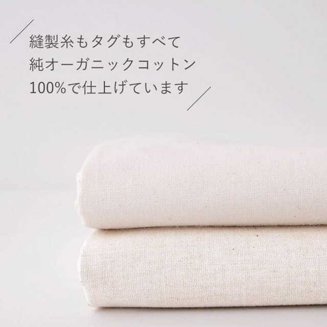 オーガニックコットン独特の温かな肌ざわりが心地よい眠りを与えてくれます。夏はさらりとした風合い、冬はじんわりとした温かみでカラダを包んでくれます。 ほどよい温もりと通気性のよさで、快適な寝心地をお届けします。 シンプルだからこそ実感 たて糸とよこ糸を交互に織ったプレーンな生地は、さらりとした肌ざわり。やわらかさと丈夫さを兼ね備えるために、少し細めの40番手の糸を2本どりにして織りあげています。 生地に少し厚みをもたせ、寝返りをしてもよれにくく、やわらかでふんわり感もあります。 オーガニックコットンならではの温かさがあり、シンプルな無地だからこそ極上の素材感を味わうことができます。 ふとんがずれないように内側にひもがついています。 ★「メイド・イン・アース」のこだわりオーガニックコットンの風合いをできるだけ活かせるよう、化学薬剤による脱脂、漂白、柔軟加工をせずに、製品づくりをしております。 日本国内の工場にて生地を織りあげ、丁寧な縫製で仕立てています。 生地、地糸、縫い糸、ネームタグのすべてにオーガニックコットン100%を使用しています。