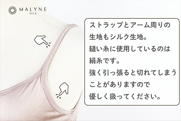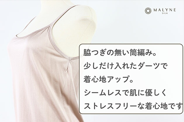冷えとり健康法では肌にふれるインナーは シルクをすすめています。シルクは、保温性・吸湿性・放湿性に富み天然繊維の中でも毒を吸い取る力が強いのです。このキャミソールの上からブラをつければお手持ちのブラも無駄になりません。