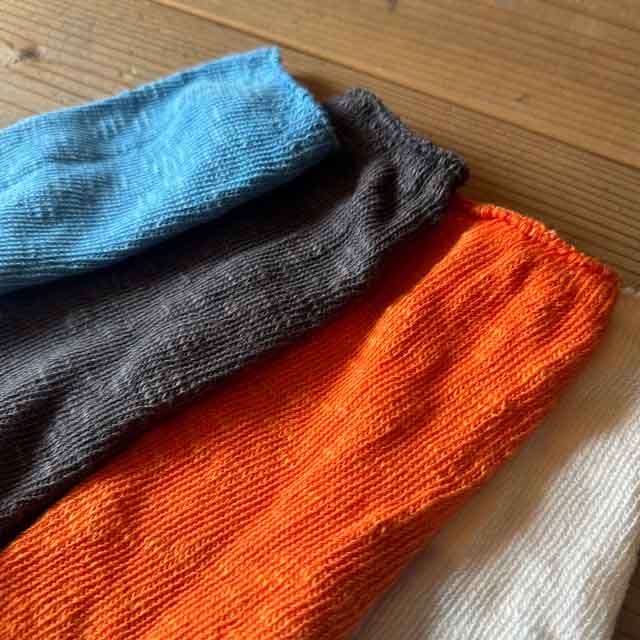 クネクネくつ下は芦屋のくつ下工場で今では数少ない昔ながらの編み機を職人さんがひとつひとつ調整していきます。ガシャンガシャンと音を立てゆっくりと出来上がるくつ下はどれもクネクネとねじれていました。それは一本一本の繊維に撚りがあるからだそうです。クネクネくつ下はプレスでカタチを整えず、織り上ったままの風合いでお届けすることにしました。履いて・洗ってを繰り返すうちに繊維の撚りがゆるみ、糸がふわっと膨らんでねじれがとれ、優しい履きごこちに馴染んでいく姿がとても愛らしく思えるからです。自然素材を使った締めつけないくつ下で足下の小さな幸せをお届けいたします。
