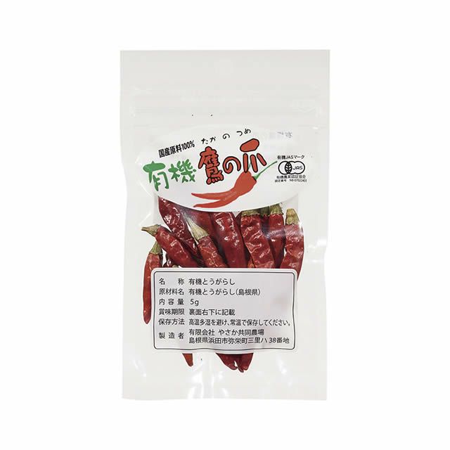 島根産有機鷹の爪 ■香り高く、色鮮やか ■辛みがいきている ■さまざまな料理のスパイスに ■数量限定品 【調理法・使用方法】 細かく刻んで漬け物や、中華料理をはじめとする各料理の辛味づけに。