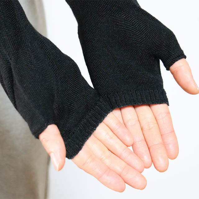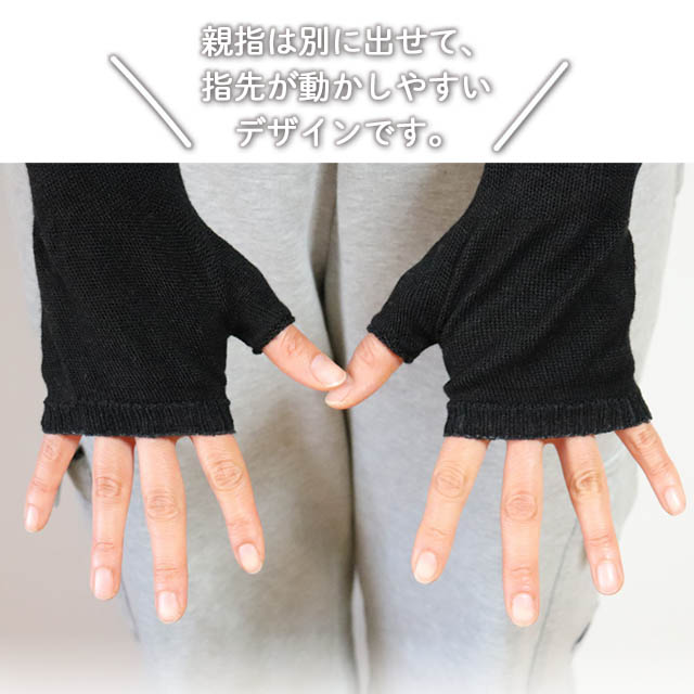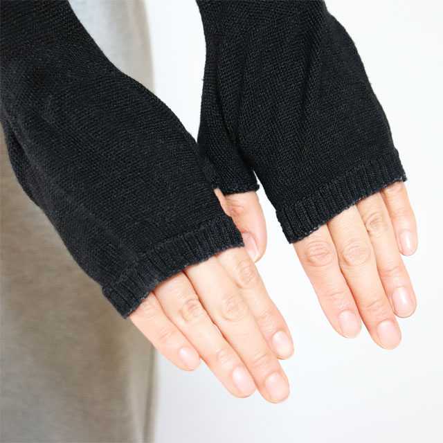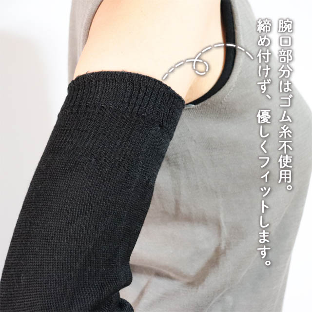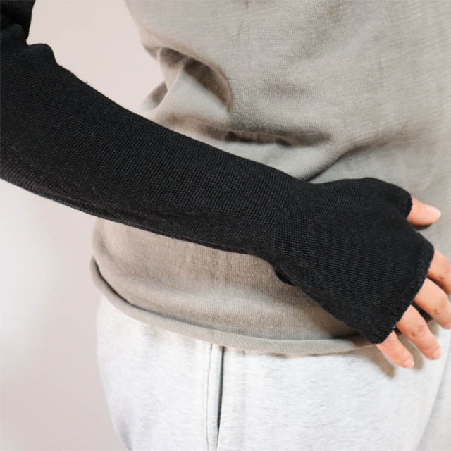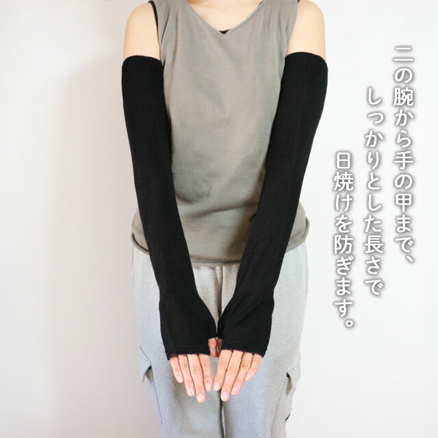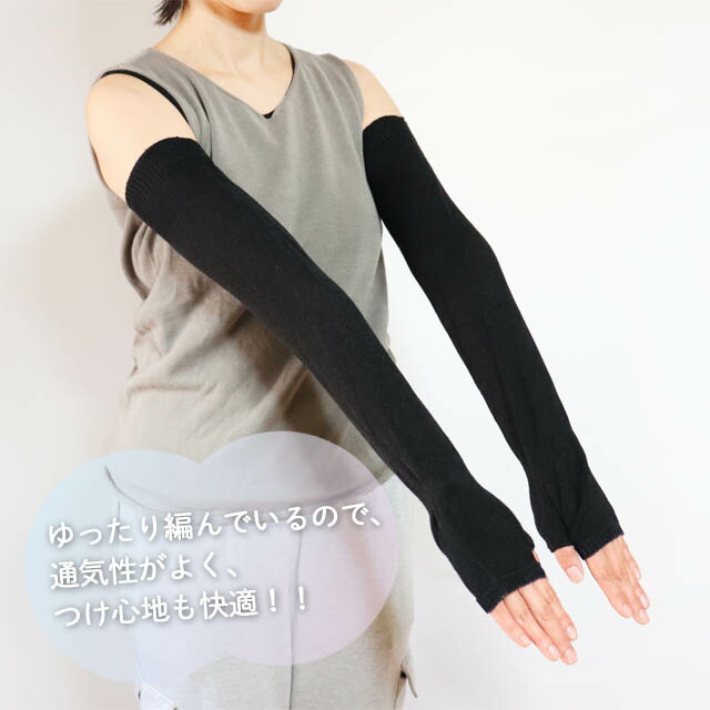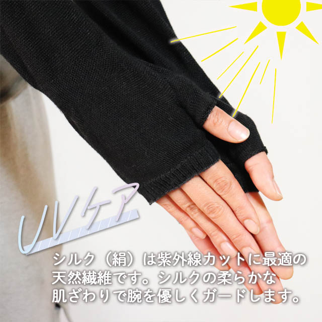 シルク100%天然のUVカット&さらさらのつけ心地紫外線カットに最適の天然繊維といわれる絹でアームカバーを作りました。約47cmの長さで、腕から手の甲の日焼けを防ぎます。カラーは、より紫外線を遮る黒1色になります。 ゆったり編んでいるため、通気性がよく、つけ心地も快適!ゴム糸を使用していないので、締め付け感がありません。親指は別に出せて、指先が動かしやすいデザインです。 指先が出ているから、スマートフォンの使用にも便利。車や自転車の運転時のUV対策にもおすすめです。 ご愛用者様の声 一般のアームカバーは、暑いとどうしてもつけるのがいやになって、日焼け対策を半分あきらめていました。『シルクUVカットアームカバー』は、ふんわり軽くて肌に密着しないため、わずらわしさがありません。面倒くさがりで、あまり習慣づかない私でもいつもつけるようになり、室内に戻っても、忘れてそのままつけっぱなしでいることも何度かあるくらいです。このアームカバーひとつで満足しています。(40代女性)