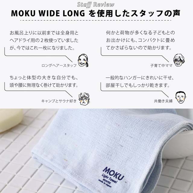 MOKU Light Towelは、吸水・速乾性に優れ、薄くて持ち運びにも便利なタオル。コンテックスのベストセラーで多くの方に指示されている大人気タオルです。 そんなMOKUシリーズの中で、サウナや銭湯で非常に使い勝手が良いサイズとして開発したワイドロング。 数量限定カラーのため、どんな色が出てくるのか楽しみでもあります。 MOKUのタオルのここがいい!! 室内干しでもすぐ乾く MOKUは通気性に優れる細番手の糸とコンテックス独自の織技法で、季節によっては部屋干しで1時間半ほどで乾いてしまう速乾性を実現しました。 すぐに乾くので嫌な臭いも気になりません。キャンプやアウトドア、釣り、サウナ、銭湯、ガーデニング、旅行など、お出かけの際の心強いタオルです。 色味が個性的 MOKUは先染めの糸で織り上げた生地の上から染め加工を施しています。 ところどころに生地から顔をのぞかせるネップ(糸のかたまり)が 個性的な色味をさらに表情豊かにしています。 今治クオリティの吸水力 おだやかで美しい瀬戸内の海にかこまれた綿織物の産地、「今治」。染色、織り、縫製など、日本の優れた手の技で、こだわりもって作られています。吸水力は、綿100%であることに加えて、今治の熟練工が丁寧に不純物を落としているので、しっかりと水を吸いとってくれます。ふんわりと柔らかい手触りで、気持ちの良いタオルです。 痒い所に手が届く絶妙なサイズ感。 人気のMサイズよりも横幅7cm 長さ20cm 大きくなり、これ一枚でバスタオルにもヘアドライ用にも大活躍。 もちろん従来通りフェイスタオルとしても使えるサイズ感です。 長さと横幅もあるので、腰や頭に巻いて使うにも簡単です。軽くて持ち運びが楽!重さは約70gで軽量。通常のタオルより1.5倍細い糸を使用しているため、とても薄手でコンパクトに収まります。数量限定カラー 数量限定のため、在庫限りの販売となります。 今後も同じように数量限定でシーズンに合わせて限定色での販売を予定しております。