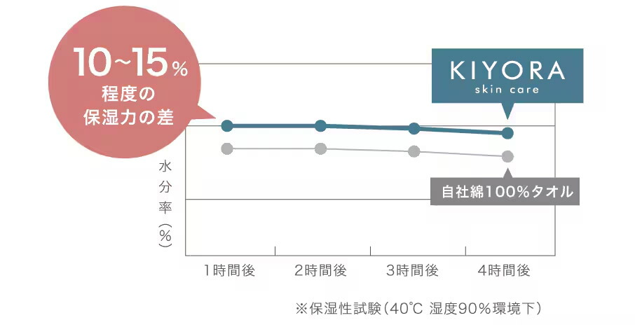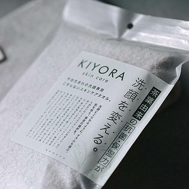 KIYORAのラインナップの中で、最も肌への優しさを追求したのが、「KIYORA skin care」です。ブランド共通の「清潔さ」に加え、洗顔後の無防備な肌を守るための「潤い」をプラスした、洗顔専用の特別な一枚。毎日の洗顔を、ただの水気を拭き取る作業から、スキンケアの一部へと変える。そのこだわりをご覧ください。 いつもの拭き方、タオルと一緒に見直しませんか? 洗顔を終えたその瞬間から、肌の乾燥は始まっています。ゴシゴシと擦るように拭くのは逆効果。摩擦は、デリケートな肌にとって最大の敵だからです。洗顔後の肌に必要なのは、強く「擦る」ことではなく、「そっと包み込んで、当てる」こと。必要な潤いは残し、余分な水滴だけを吸い取る。肌にとっての最適なケアを叶えるために、「KIYORA skin care」は生まれました。 長年、今治で「いかに水を吸うか」を追求する中で、ひとつの疑問が生まれました。「高すぎる吸水性は、洗顔後のデリケートな肌から、必要な潤いまで奪っているのではないか?」 たどり着いた答え。それが、「繊維そのものが潤いを含んだ、肌を守るための素材」と、「顔全体を一度で包める40cm」というサイズでした。 洗顔を変える、茶の実由来のうるおい。 肌への優しさを追求し、選び抜かれた素材。 それは、日本のお茶処・静岡で育った「茶の実」から採れる希少なオイル。私たちが巡り会ったのは、このオイルと茶葉のカテキンを繊維に練り込んだ特別な糸。その出会いが、洗濯を繰り返しても続く「しっとり感」を実現しました。一般的な綿タオルよりも多くの水分を繊維に抱え込み、そのなめらかさはシルクに迫る数値を示します。素材そのものが持つ潤いで、デリケートな顔を優しく包みます。 タオルそのものが、菌を減らし続ける。 この素材が特別なのは、潤いだけではありません。一般的な抗菌防臭タオルの基準値「2.2」に対し、本製品は肌トラブルの原因菌のひとつ、黄色ブドウ球菌試験において、検出限界値に近い「5.9」を記録。その高い抗菌力の秘密は、糸の内部に練り込まれた「茶葉由来のカテキン」。この結果は、普通の綿なら18時間で菌が約700倍に増えるところが1/1000以下に減少したことを意味します。 洗っても効果が持続する耐久性。 表面的な後加工とは異なり、繊維そのものに抗菌力を持っているため、洗濯を繰り返してもその効果は衰えません。湿気の多い脱衣所でも、見えない不安を、肌への安心に変えるタオルです。 洗顔後や、お風呂上がり。まず一番にこの40cmのタオルを顔に当ててください。ゴシゴシと擦る必要はありません。顔全体にそっと「置く」だけで、水滴だけをスッと吸い取ります。タオルを外した肌には適度な水分が残り、もっちりと柔らかい。そこへ化粧水が素直に吸い込まれていく心地よさ。この驚くほど肌へ馴染んでいく感覚を知ると、もう普通のタオルには戻れないかもしれません。 清潔も、やさしさもあきらめない、40cmの最適解。 ペーパータオルの清潔さと、上質なタオルの肌触り。もう、どちらか一つを選ぶ必要はありません。 毎日触れるものだからこそ。まずは一度、「KIYORA skin care」をあなたの肌で感じてみてください。これまでにないスキンケア体験が、ここから始まります。 〈 試験データおよび製品に関するご注意 〉 ●本製品は医薬品・医薬部外品ではありません。 ●すべての臭いに対して効果を保証するものではありません。 ●使用環境により効果は異なります。 ●上記のデータは第三者機関による洗濯10回後の(一社)繊維評価技術協議会のSEKマーク 繊維製品基準に準拠した消臭性試験の結果に基づきます。