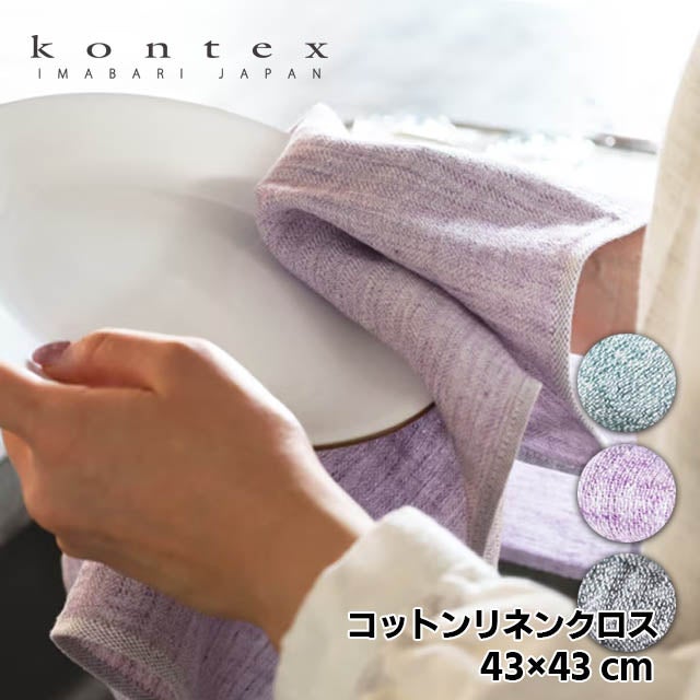 「リネン100%は少し硬くて馴染むまで時間がかかる」 「コットン100%は水分を含むと乾きにくい」 そんな、どちらかの素材だけでは届かなかった使い心地を、絶妙なバランスで形にしました。 50%ずつ、素材を混ぜることで生まれた心地よさ 「すぐ乾いてほしいけれど、最初から柔らかい方がいい。」 そんなわがままを叶えるために、リネンとコットンを半分ずつ合わせました。 リネンが持つ速乾性はそのままに、コットンを混ぜることで特有のゴワつきを解消。 使うほどに風合いが育っていくリネンの楽しさを、届いたその日から実感していただけます。ハンギングループ付きkontexの文字がかかれたループが付いています。タオルハンガーにかけるだけでなく、吊るしてもお使いいただけます。産地は、おだやかで美しい瀬戸内の海にかこまれた綿織物の町、『今治』。染色、織り、縫製など、日本の優れた手の技で、こだわりもって作られています。薄手で扱いやすく、器の形にすんなり馴染み、水分をすっと吸い取ります。 驚くほど速く乾くので、キッチンの清潔感をずっとキープ。どんなインテリアにも溶け込む、清潔感あふれるニュアンスカラーの3色。 棚に畳んである姿もキッチンに掛かっている姿も、どこか絵になる一枚です。