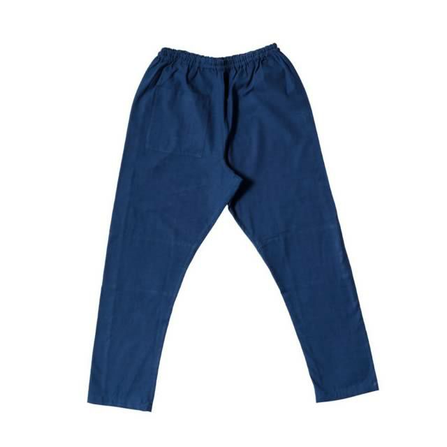福岡県八女市にある、地元地域のものづくりと土地の魅力を伝えるアンテナショップ「うなぎの寝床」のオリジナルです。伝統的な久留米絣には手織り、藍染のイメージもありますが、うなぎの寝床の久留米絣のもんぺに関しては「機械織り・化学染料染め」の工房の生地を使用しています。理由は2つです。 1.藍染、手織りの久留米絣は色・肌触りがよく、さらに使い込むほど風合いが増していく良い生地ですが、もんぺに仕立てた場合に価格が高くなりすぎるのが難点です。手織りほどの着心地は得られませんが、化学染料染め・機械織りの久留米絣の生地を使うことでコストをおさえ、日常着としてお楽しみ頂けるように仕立てています。 2.化学染料は様々な色が作れるのが特徴です。藍だけでは出せない豊富な色・柄の生地ができるので、洋服にも合わせやすく現代のファッションに取り入れやすいもんぺが仕立てられます。