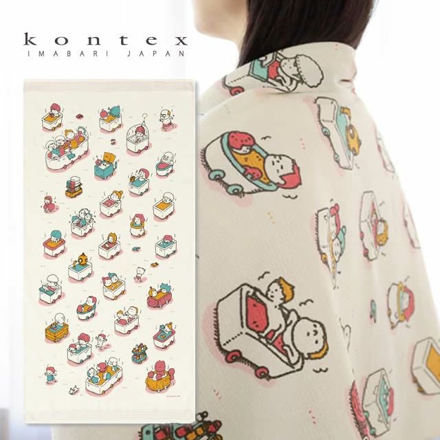 大人気絵本作家ヨシタケシンスケさんとコラボレーションしたタオルてぬぐいが登場! ヨシタケシンスケさんの様々な絵本から飛び出したキャラクターたちがお風呂でくつろぐ特別な一枚です。 イラストはこのタオルてぬぐいの為の描き下ろし!どの絵本のどのキャラクターがいるかじっくり眺めて探してみてください。 ヨシタケシンスケ おふろタオルは2サイズ展開。どちらも銭湯に持って行くのに便利なコンテックスの大人気タオルです。 タオルてぬぐいはグリーン系、大きなタオルてぬぐいはピンク系と、配色のバリエーションも楽しく仕上がっています。 片面にパイルがありしっかり拭けるのに、手をかざすと透けるほど薄手なので通気性に優れ、乾きも速く常に清潔に保てるのもうれしいポイントです。 毎日使ってもすぐ乾く、快適な使用感で季節を問わず活躍してくれること間違いなしです。 タオルてぬぐいは約50g、大きなタオルてぬぐいは約110gと、驚くほど軽量&コンパクト。 同じサイズの通常のタオルの1/3の軽さ(当社比)なので、銭湯に持っていくのにピッタリ! ご自宅でも収納時にかさばらず、洗濯物のボリュームダウンにもなり毎日の生活が快適になります。 一般的なバスタオルと同じ58×120cmのサイズは、大人でも体にグルっと巻きつけたり、小さなお子さまは身体をすっぽり覆うことができます。