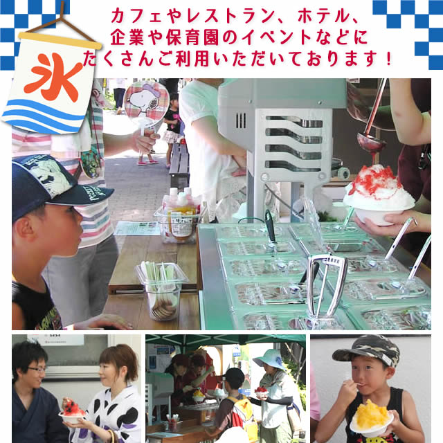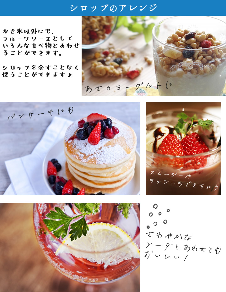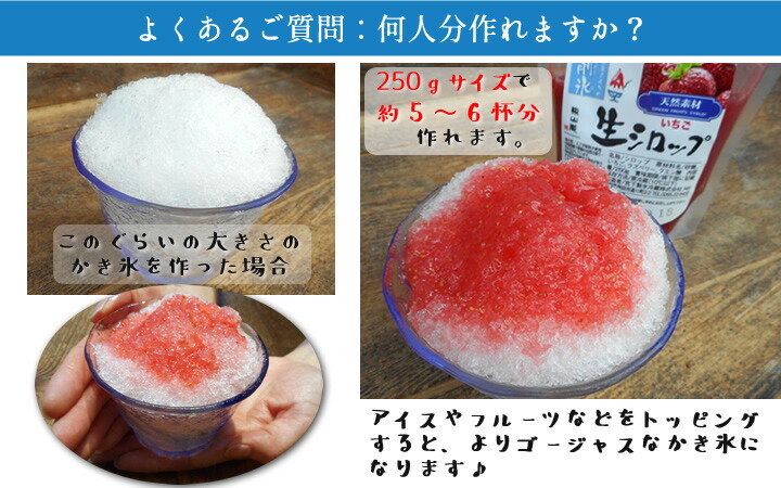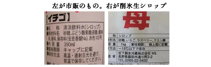 市販のかき氷シロップの原材料ラベルをご覧になったことはありますか?よく市販で売られているかき氷シロップですが、実はこれ、砂糖水に香料や着色料などの食品添加物を加えただけなものがほとんどです。「イチゴ」味の場合、果汁は一切使っていません。かき氷を食べると舌が赤くなるのは「赤色102号」のせい。 アレルギーなどの原因になる疑いがあり、ノルウェーでは使用禁止になっている添加物です。 保存料に使われている「安息香酸Na」は変異原性(細胞に突然変異が起こる)があり、発がん性もみとめられています。 一方、無添加のシロップは、原材料はいたってシンプル。もちろん、味も香りも全然違います! 氷屋さんちの削氷(けずりひ)生シロップが選ばれる3つの理由 1.シロップの素材は、本物の果実! マンゴー以外は、国産・信州産の果物にこだわって作られています。 生のフルーツから作られたシロップは、本物の素材がもたらしてくれる 「あとに残らない」という食後感があります。 2.独自の低温殺菌技術でフレッシュな味わい せっかくのフレッシュなシロップも高温で処理すれば、色も風味も変わってしまいます。天然素材の自然な味・色・香りを活かす独自の低温殺菌技術。装置の開発から始めて、ようやく製品化にたどりつきました。 3.着色料・香料・保存料・人口甘味料 すべて無添加 一般のかき氷シロップによく含まれている、着色料・香料・保存料・人口甘味料の添加物を使用していません。小さな子どもさんにも安心して出せるかき氷です。 保育園や幼稚園のイベント、文化祭・学園祭、地域の夏祭り・納涼祭・縁日、企業イベント(ショールームイベントや暑気払い)にもどうぞ!「素材の確かな美味しいものを使いたい」という方におすすめです。また、カフェやレストラン、ホテルなど多くの業者様よりご利用いただいております。よくあるご質問何人分作れますか?シロップが余らないか心配… R A N K I N G―削氷|かき氷生シロップ250g― 削氷かき氷シロップ250gランキング1位|いちご 削氷かき氷シロップ250gランキング2位|ぶどう 削氷かき氷シロップ250gランキング3位|みかん R A N K I N G―削氷|かき氷生シロップ1kg― 削氷かき氷シロップ業務用ランキング1位|いちご 削氷かき氷シロップ業務用 ランキング2位|抹茶 削氷かき氷シロップ業務用ランキング3位|すずらん牛乳 ミルクソース R A N K I N G―削氷|かき氷生シロップセット― 削氷かき氷シロップセットランキング1位|生シロップ6個セット 削氷かき氷シロップセットランキング2位|お徳用4kgセット 削氷かき氷シロップセット ランキング3位|信州育ちのフルーツ生シロップセット R A N K I N G―フルーツバスケット|かき氷シロップ180ml― フルーツバスケットかき氷シロップランキング1位|いちご フルーツバスケットかき氷シロップランキング2位|ぶどう フルーツバスケットかき氷シロップランキング3位マンゴー